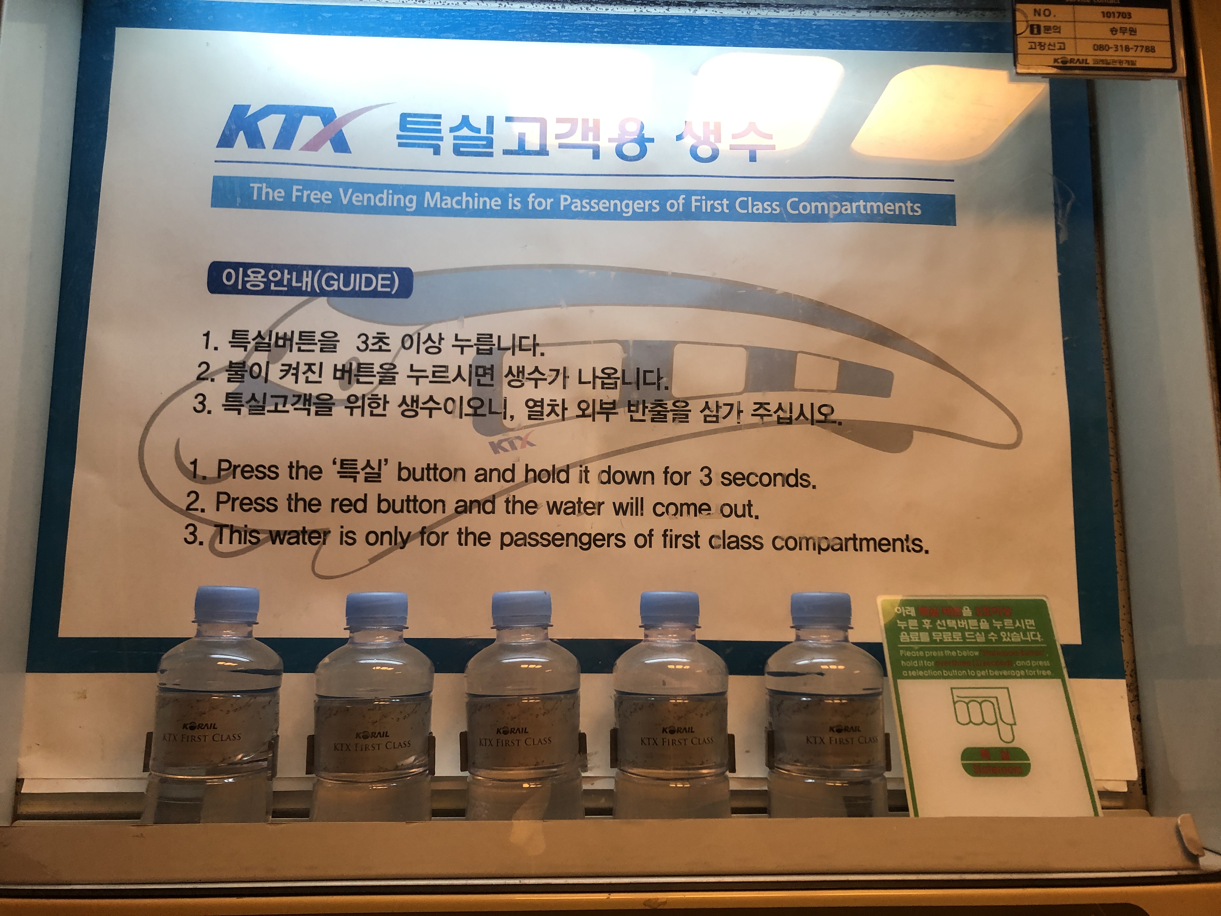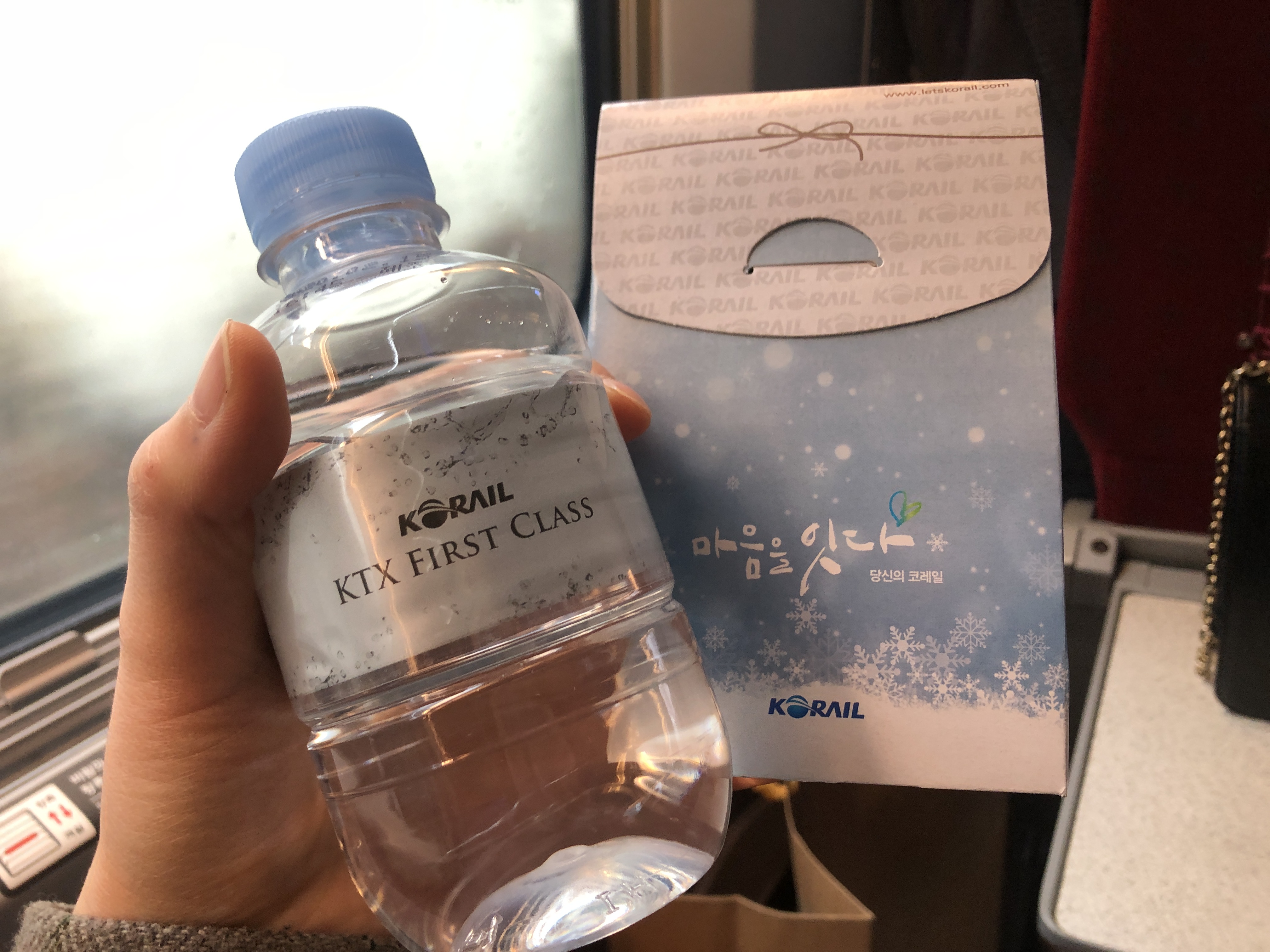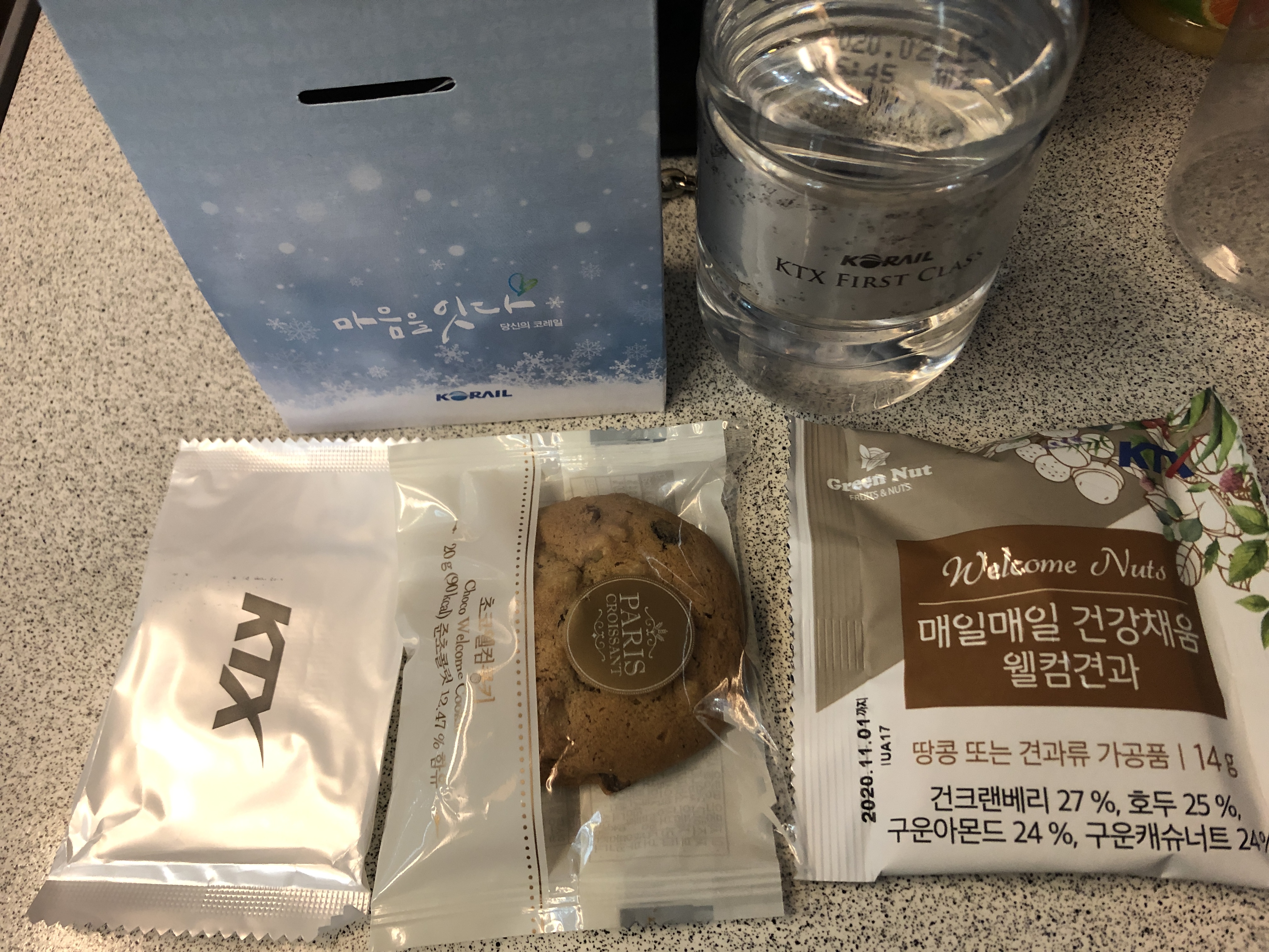 특실을 예매하면 물과 간단한 다과가 제공되는데 전엔 승무원이 지나다니면서 줬다면 요즘은 코로나때문에 특실 입구 통로에 비품이 비치되어 있다. 이게 더 편리한 듯하다.