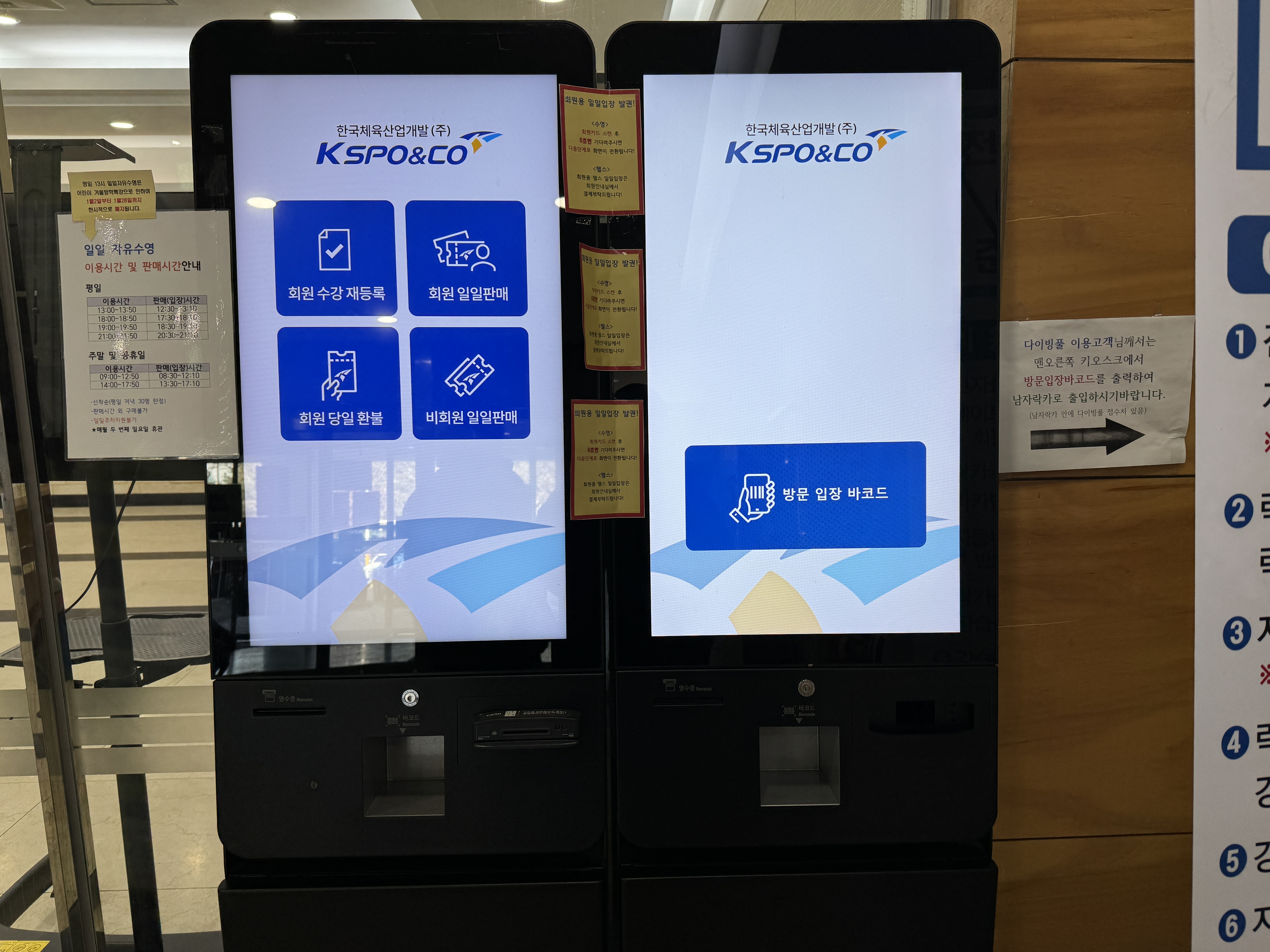 중앙에 오른쪽 키오스크에서 방문 입장 바코드를 발권하고 탈의실로 들어가서 선생님 이름 말하면 락카번호를 알려줍니다.