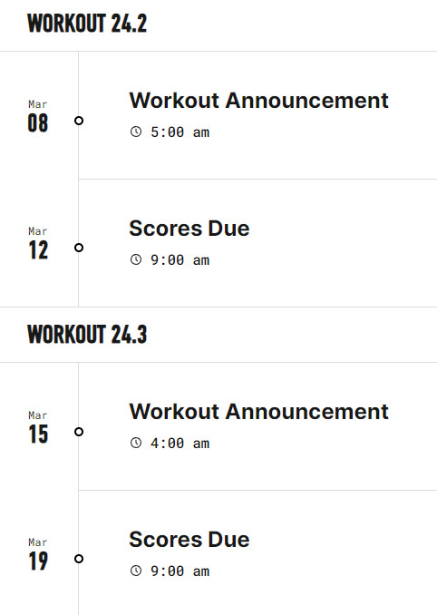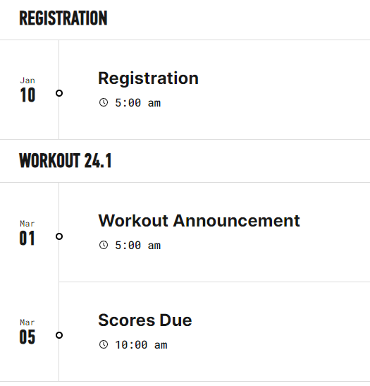 2024 크로스핏 일정은 오픈 2.29~3.18, 쿼터파이널 4.3~22, 세미파이널 5.8~6.2, 크로스핏게임즈 8.9~12 입니닷