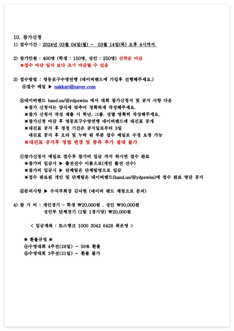 ⓑ네이버밴드 band.us/@ydpswim 에서 대회 참가신청서 및 공지 사항 다운
